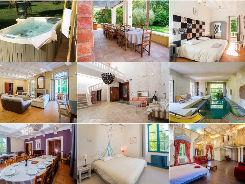 - Des chambres de toute taille et de toute forme : 8 chambres dont 1 théâtre de 60 m2, 5 salles de bain ou d'eau, 3 lits king-size et 12 lits simples.